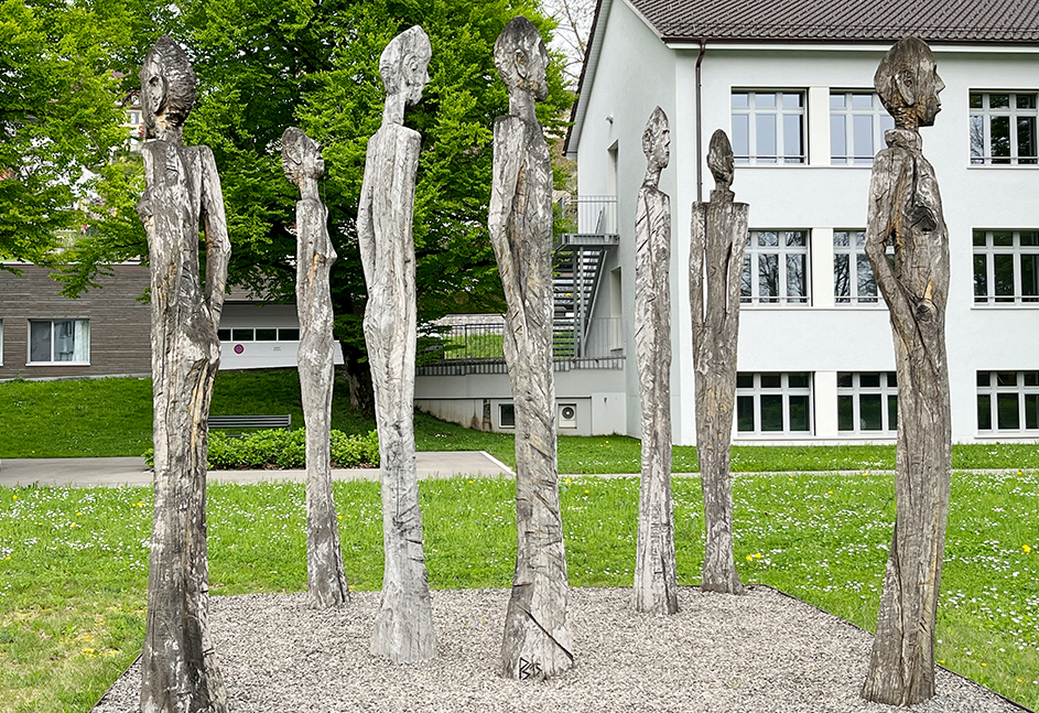 Der Schänner Holzbildhauer schneidet mit der Kettensäge in sich versunkene Figuren – eine Gruppe, und doch jede(r) für sich.